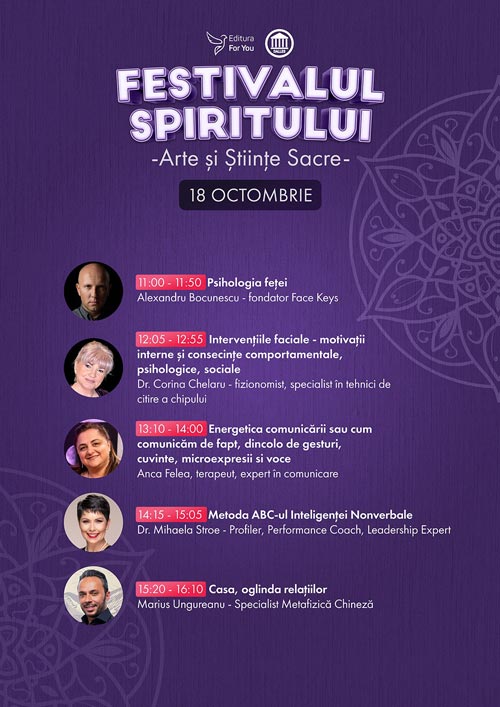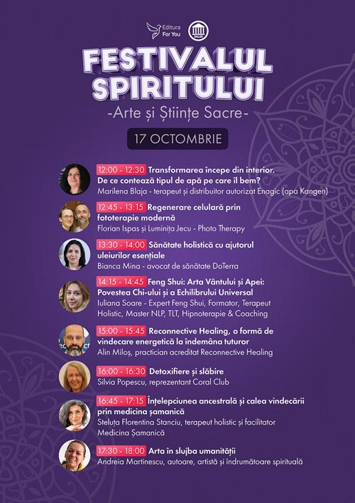 Târgul festivalului include instrumente care susțin echilibrul minte-corp-spirit, iar programul de conferințe este construit în jurul unor personalități consacrate din domeniul spiritualității.