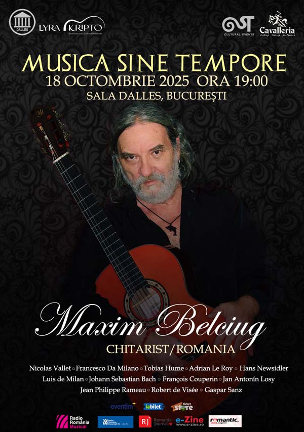 Pe 18 octombrie, Maxim Belciug, unul dintre cei mai importanți chitariști români, deschide seria de concerte Musica Sine Tempore și aduce la Sala Dalles un recital solistic extraordinar în care muzica respiră liber și direct, în ritmul natural al sincerității totale. Programul include lucrări lucrări semnate de Francesco da Milano, François Couperin, Jan Antonín Losy, Luis de Milan, Johann Sebastian Bach, Jean Philippe Rameau, Robert de Visée sau Gaspar Sanz, într-o selecție ce prilejuiește reîntâlnirea cu farmecul sclipitor al muzicii vechi, care înobila viața oamenilor la curțile Europei în timpurile de aur ale istoriei. O ofertă de neratat pentru o seară de toamnă căci, se știe, muzica barocă limpezește mintea și încălzește sufletul.