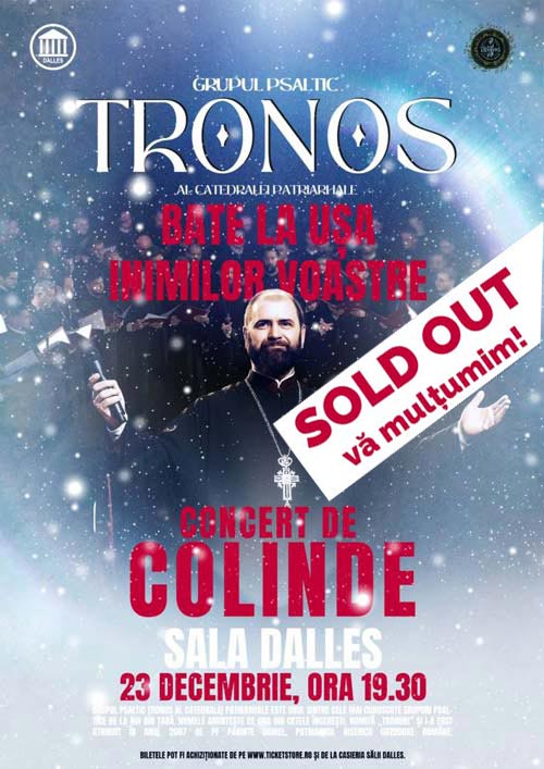Aflat deja la cea de-a patra ediție la Sala Dalles, Concertul de colinde susținut de Grupul Psaltic „Tronos” condus de părintele Arhidiacon Mihail Bucă, protopsaltul Catedralei Patriarhale din București, va aduce si anul acesta multă emoție si bucurie publicului nostru.