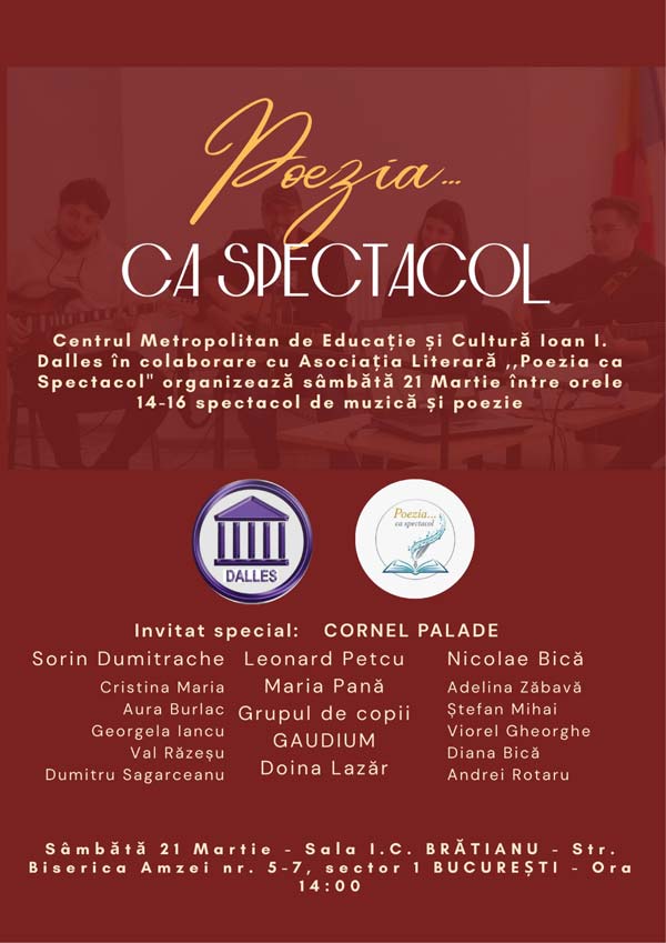 Centrul Metropolitan de Educație și Cultură „Ioan I. Dalles” în colaborare cu Asociația Literară "Poezia ca Spectacol" organizează sâmbătă, 21 martie 2026, ora 14.00, spectacol de muzică și poezie la Sala I.C. Brătianu, Str. Biserica ... Continuare