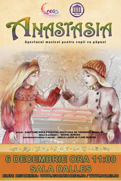 Sala Dalles Bd. Nicolae Bălcescu, nr. 18, BucureștiAnastasia - într-un vis din decembrie, spectacol muzical cu păpuși pentru copii. Adaptarea de Daniel Burcea, după povestea Anastasia de Terrence McNally.