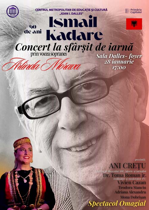 Miercuri, 28 ianuarie 2026, ora 17.00, Sala Dalles Spectacol omagial: 90 de ani Ismail Kadare Concert la sfârșit de iarnă, prin vocea sopranei Arlinda Morava prezintă: Ani Crețu Participă la eveniment: Dr. Toma Roman jr. - director ... Continuare