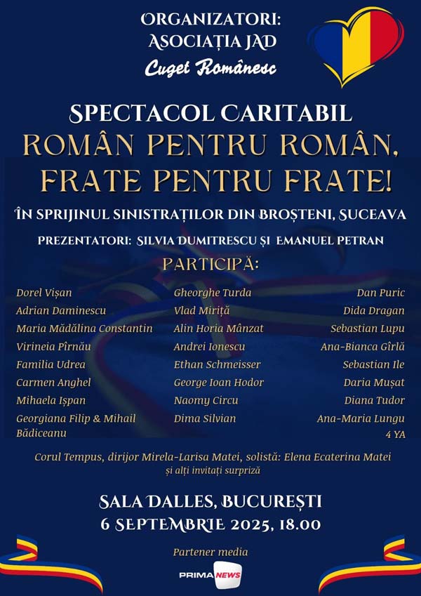 Vă invităm la un spectacol caritabil de suflet, dedicat sprijinirii familiilor din Broșteni, județul Suceava, grav afectate de inundații. Pe scenă vor urca artiști români îndrăgiți, care și-au unit vocile și talentul pentru această cauză nobilă !